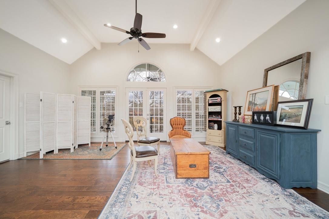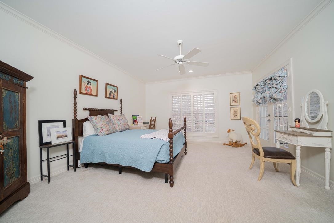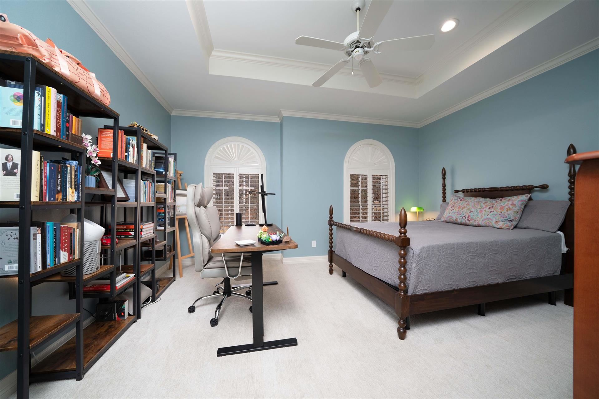 - INTERIOR: Partial Curtains, Carpeting, Tile Flooring, Hardwood Floors, High Ceilings, Bookcases, Ceiling Fan, Security System Owned, Smoke Detectors